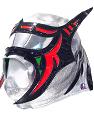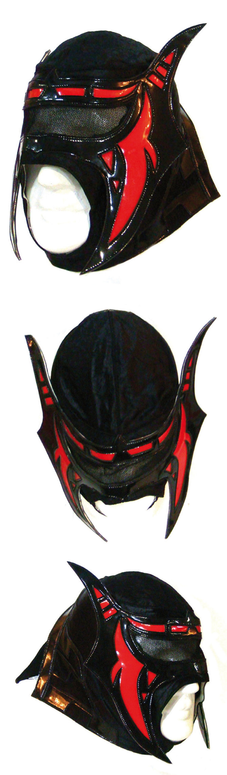 The mask is made ofnylon satin fabric and synthetic patent leather and hologram