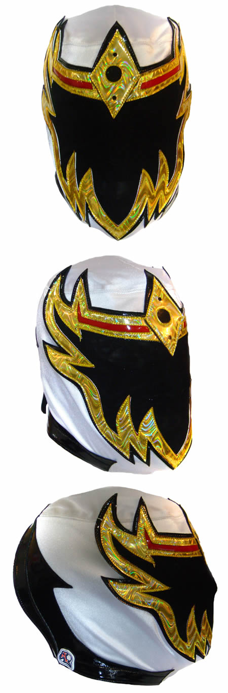 This mask has been made Raso Stretch Licra and Synthetic Patent Leather and designs with hologram. It can be made with your measurement or a Standard size (standard size means that fits to any person between 70 and 90 kg ).