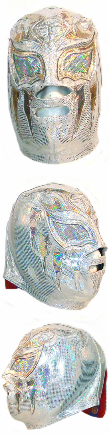 This mask has been made high shine Stretch Licra and designs with hologram. It can be made with your measurement or a Standard size (standard size means that fits to any person between 70 and 90 kg ).