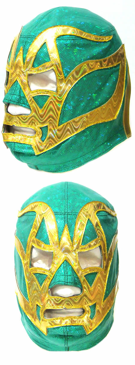 This mask has been made high shine Stretch Licra and Synthetic Patent Leather and designs with hologram. It can be made with your measurement or a Standard size (standard size means that fits to any person between 70 and 90 kg ).