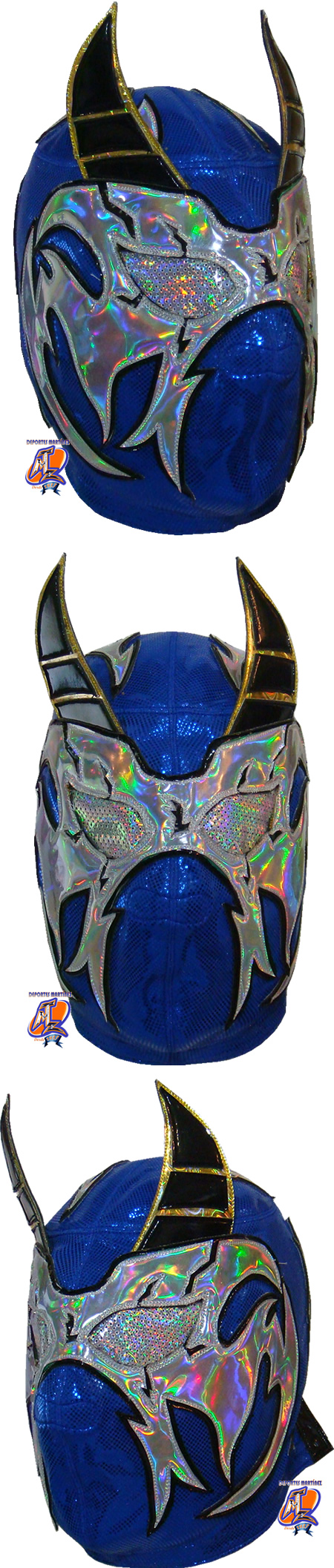 This mask has been made high shine Stretch Licra and Synthetic Patent Leather and designs with hologram. It can be made with your measurement or a Standard size (standard size means that fits to any person between 70 and 90 kg ).