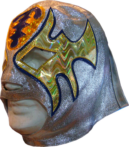 The mask is made of metallic fabric and synthetic patent leather and hologram