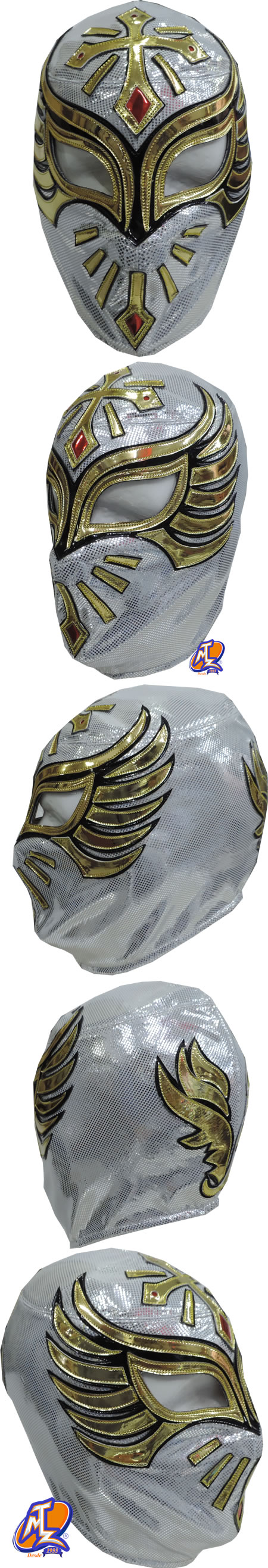 The mask is made of high shine fabric and synthetic leather