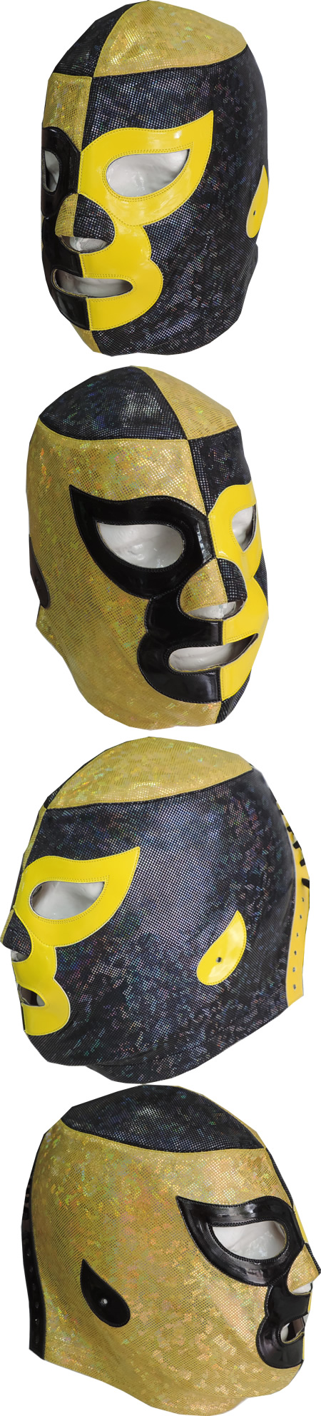 The mask is made of high shine fabric hologram and synthetic leather