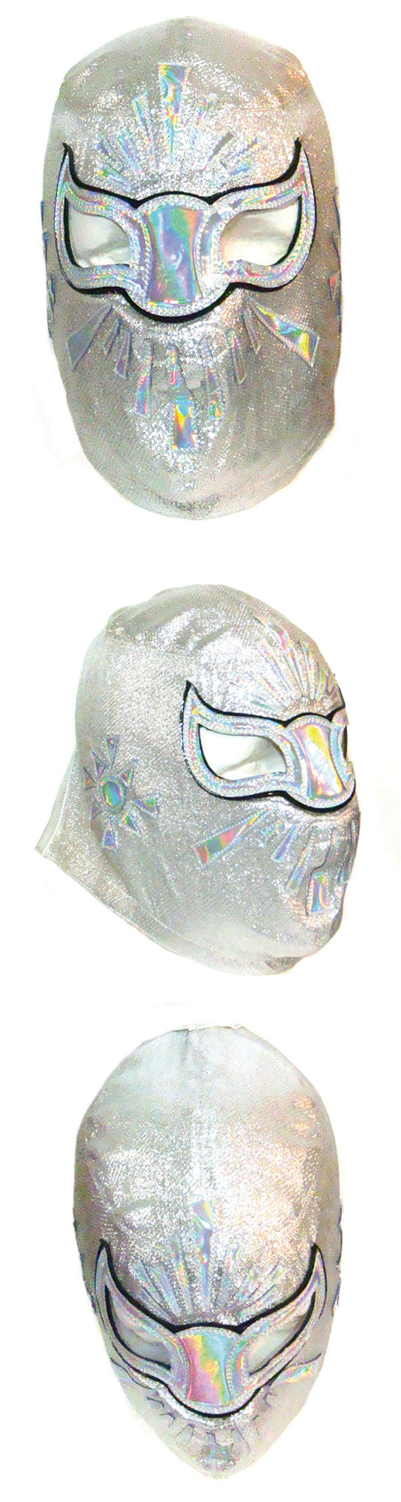 La mascara esta fabricada con tela metálica y adornos de holograma.
