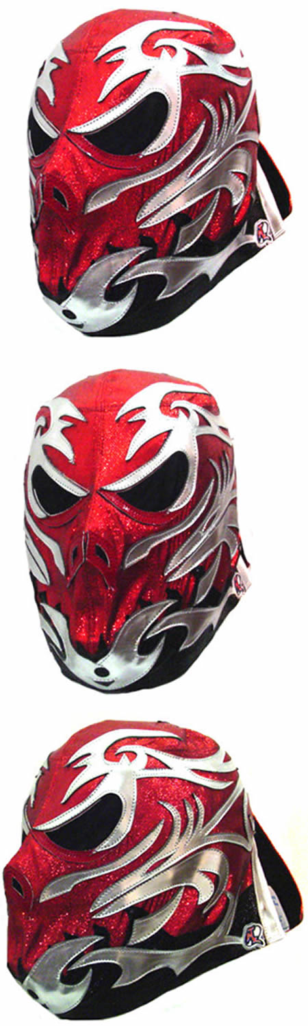 La mascara esta fabricada con tela de raso y adornos de holograma y charol sintetico.