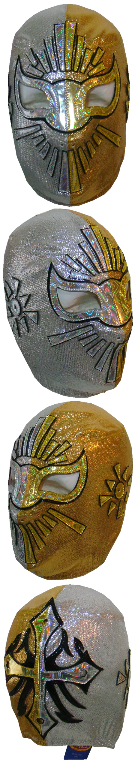 La mascara esta fabricada con tela metálica y adornos de holograma.