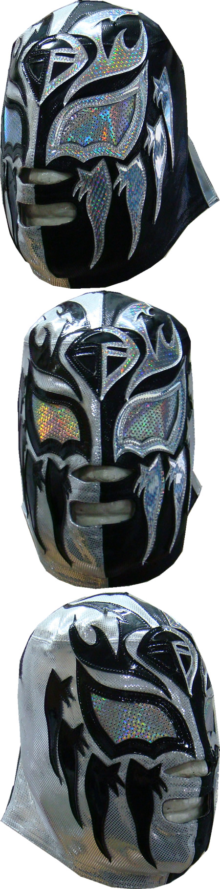 La máscara está fabricada con tela de alto brillo y piel sintética