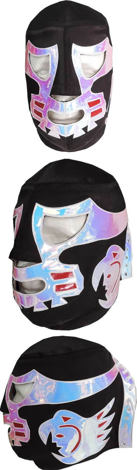 La máscara está fabricada con tela de alto brillo hologramay piel sintética