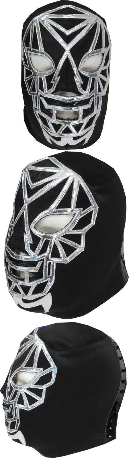 La máscara está fabricada con tela raso y charol sintético