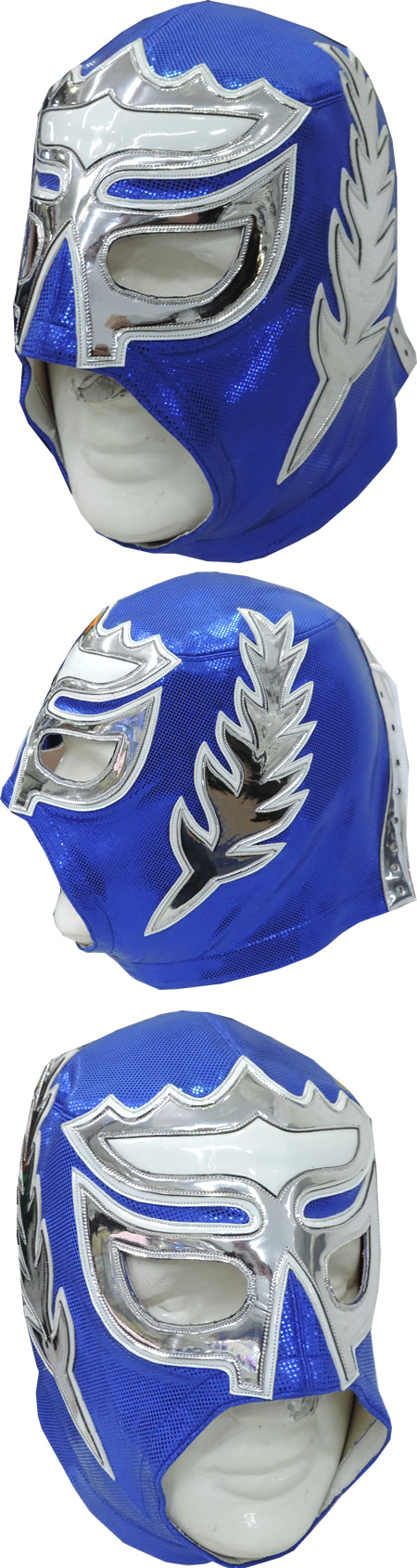 La máscara está fabricada con tela de alto brillo y piel sintética