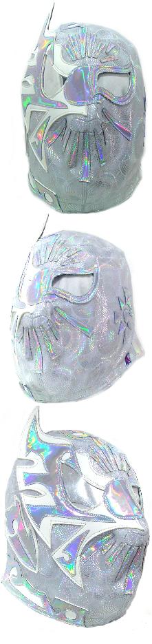 La máscara está fabricada con tela alto brillo, holograma y charol sintético