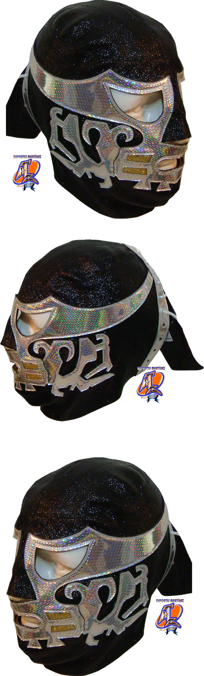 La mascara esta fabricada con tela de licra alto brillo y adornos de holograma. Puede ser confeccionada a su medida o bien una medida estándar (la medida estándar es una talla grande, que le queda a cualquier persona que pese entre 60 y 90 kg). El tiempo de fabricación lo puede consultar en la sección donde dice EVENTOS MTZ Si usted desea esta mascara en alguna otra combinación de color o talla, solo tiene que adherir los colores o las tallas que desea cambiar en el cuadro al calce que dice observaciones o instrucciones adicionales. Las bases para tomar las medidas las puede consultar en la sección COMO TOMAR MIS MEDIDAS. Todas las mascaras vienen con un estuche de plástico para mejorar su conservación. El costo de envió lo puede calcular dando click en Comprar y eligiendo el paÃs donde radica.