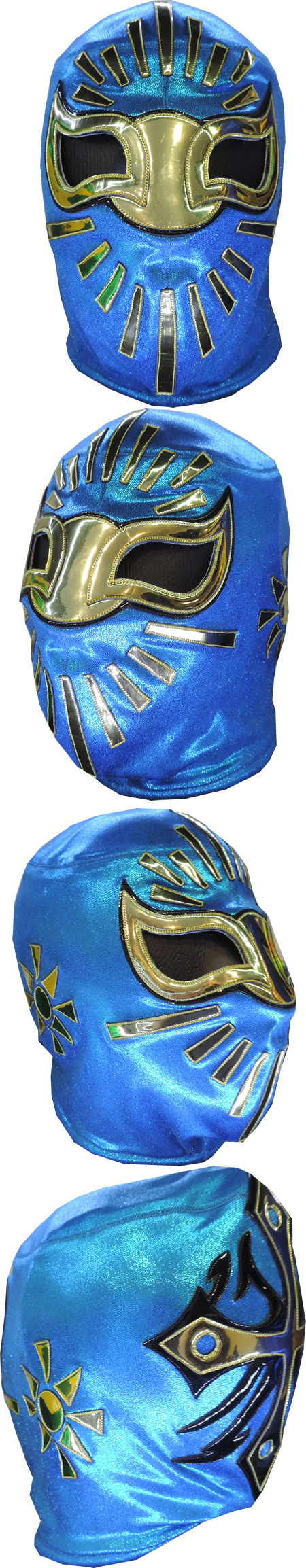 La máscara está fabricada con tela de alto brillo y piel sintética